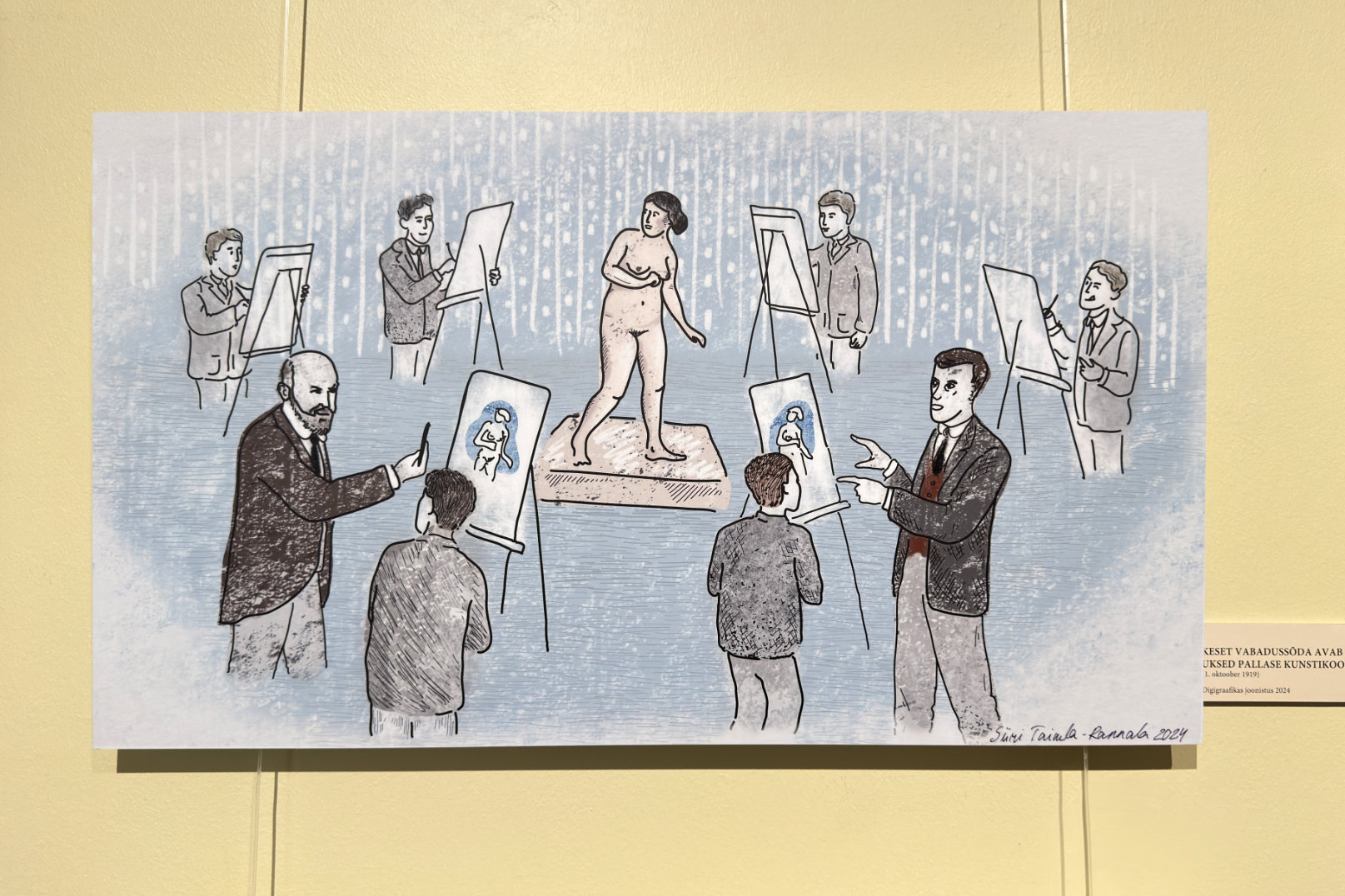 "Keset Vabadussõda avab uksed Pallase kunstikool. 1919". Siiri Taimla-Rannala näitusel "Aegvalla" Riigikogu kunstisaalis. Foto Tanel Rannala