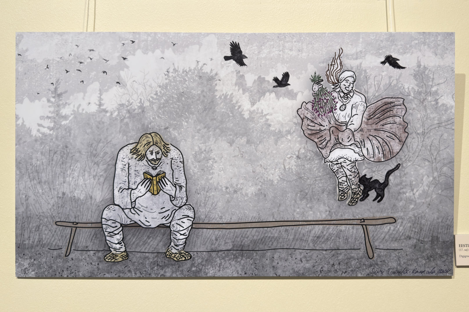 "Eesti nõiad ja lugemisoskus. 17. saj". Siiri Taimla-Rannala näitusel "Aegvalla" Riigikogu kunstisaalis. Foto Tanel Rannala