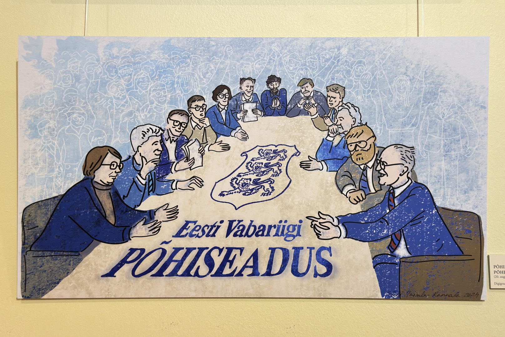"Põhiseaduse assamblee uee põhiseaduse teksti kallal. 1991–1992". Siiri Taimla-Rannala näitusel "Aegvalla" Riigikogu kunstisaalis. Foto Tanel Rannala